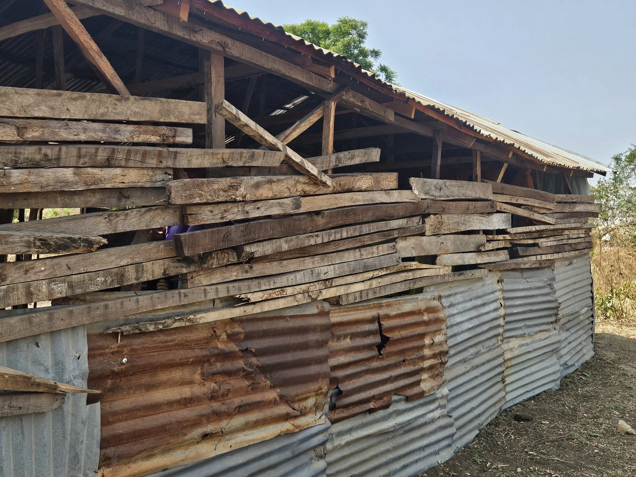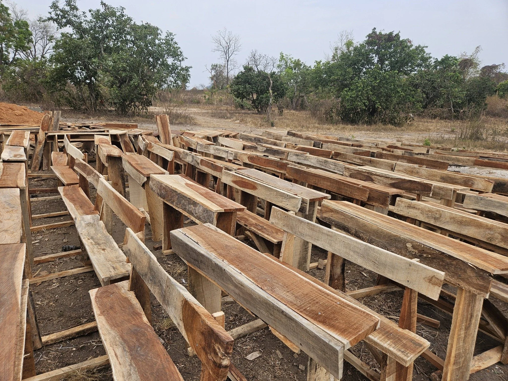 SO MANY desks! Desks are also built on-site. We haul in the lumber, and lock them away safely in a shed until school begins.