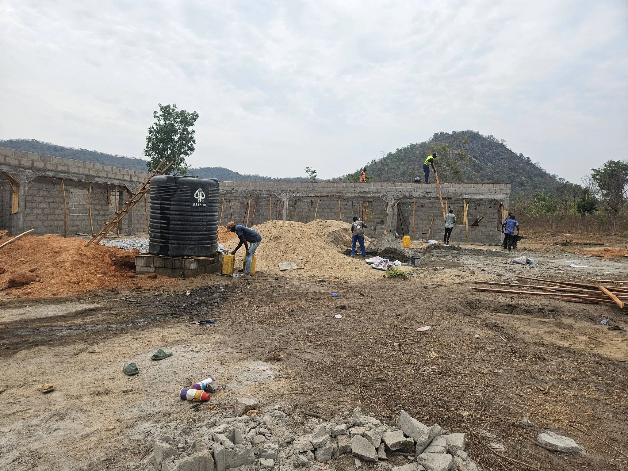 We always mold our own blocks on-site. Trucking them in is expensive, and causes too much damage to the blocks. You can see the school and teacher's quarters in the background, on the right. On the left, builders are laying the foundation for the clinic!