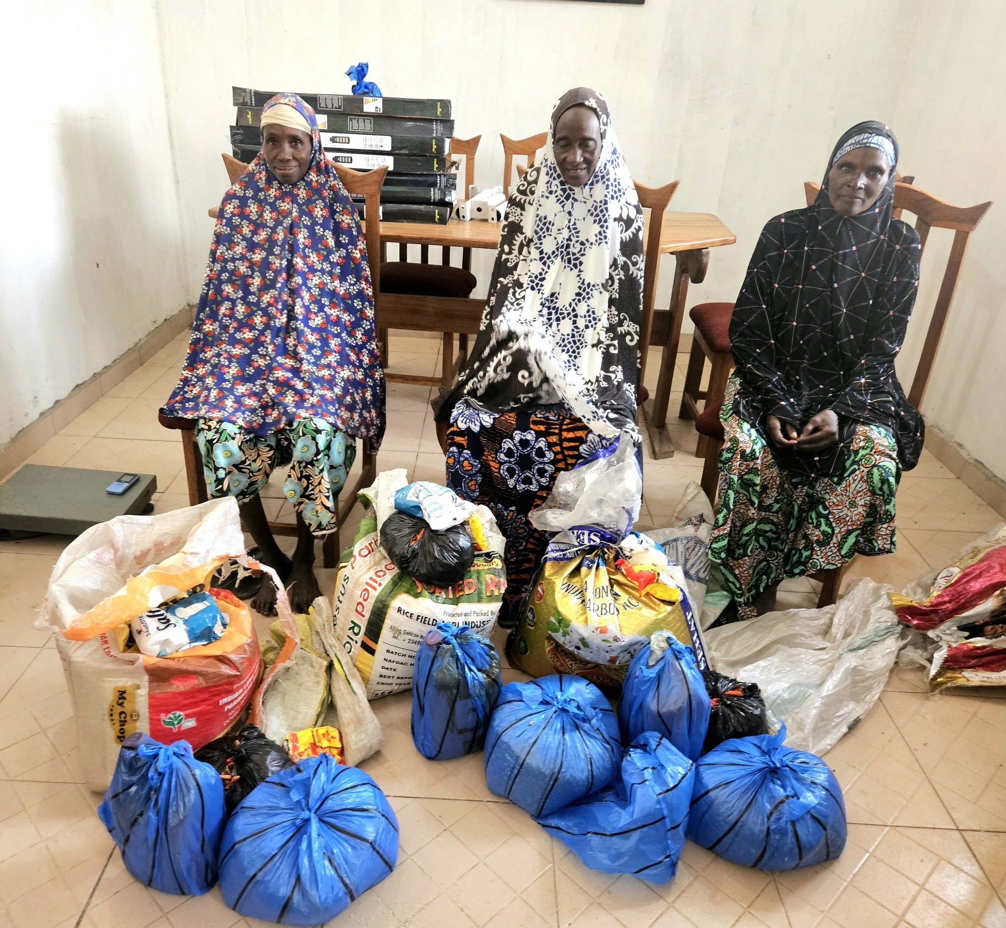 Above are the three wives of Sariki Bature, living here at Peace Village with us. Each of these women cares for six boarding students. We help them with food items such as rice, millet, cooking oil, etc.