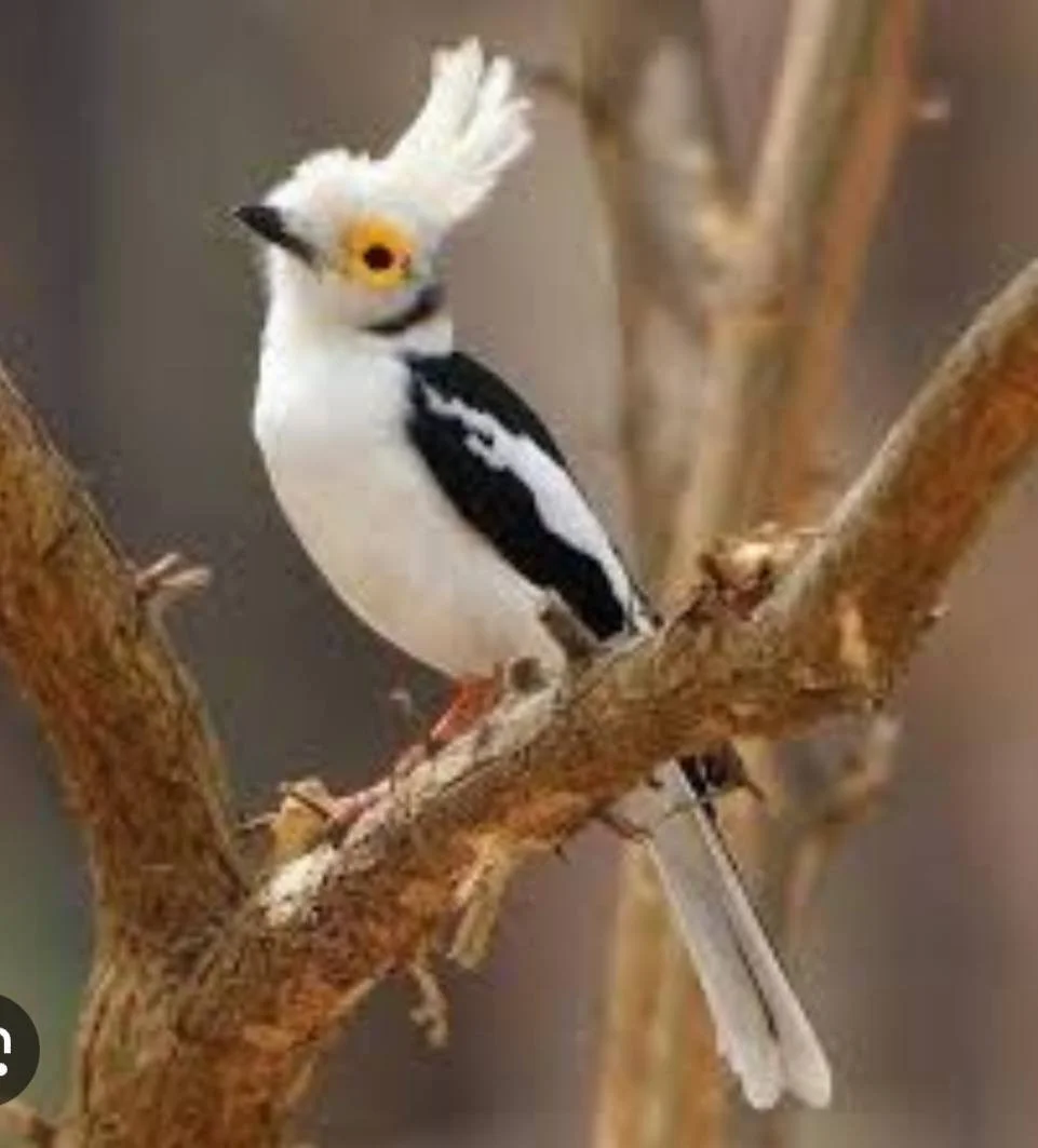 DID YOU KNOW THAT PHYLLIS LOVES BIRDS?? She says, "It's the first time for me to see this bird at Peace Village! In my photo above, the white belly, head and crest don't show well, as the bird is in the deep shade. The Google photo below shows the bird's true colors! It's a white-crested helmet shrike! This and four others swooped around the vicinity for a few minutes then took off! What a joy to see them here for the first time!
