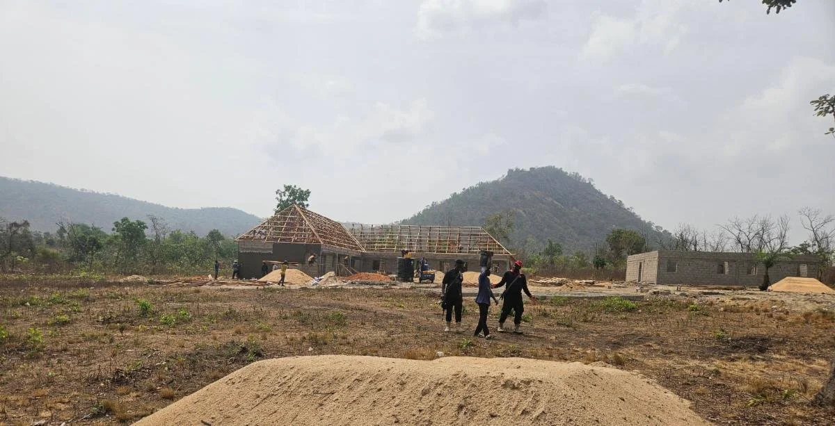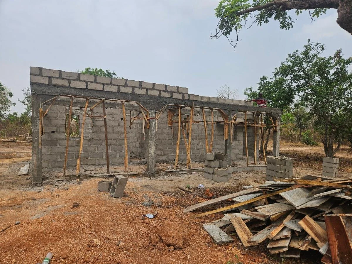 Other work is going forward, as you can see! The school roof is taking shape, and the clinic walls are up!